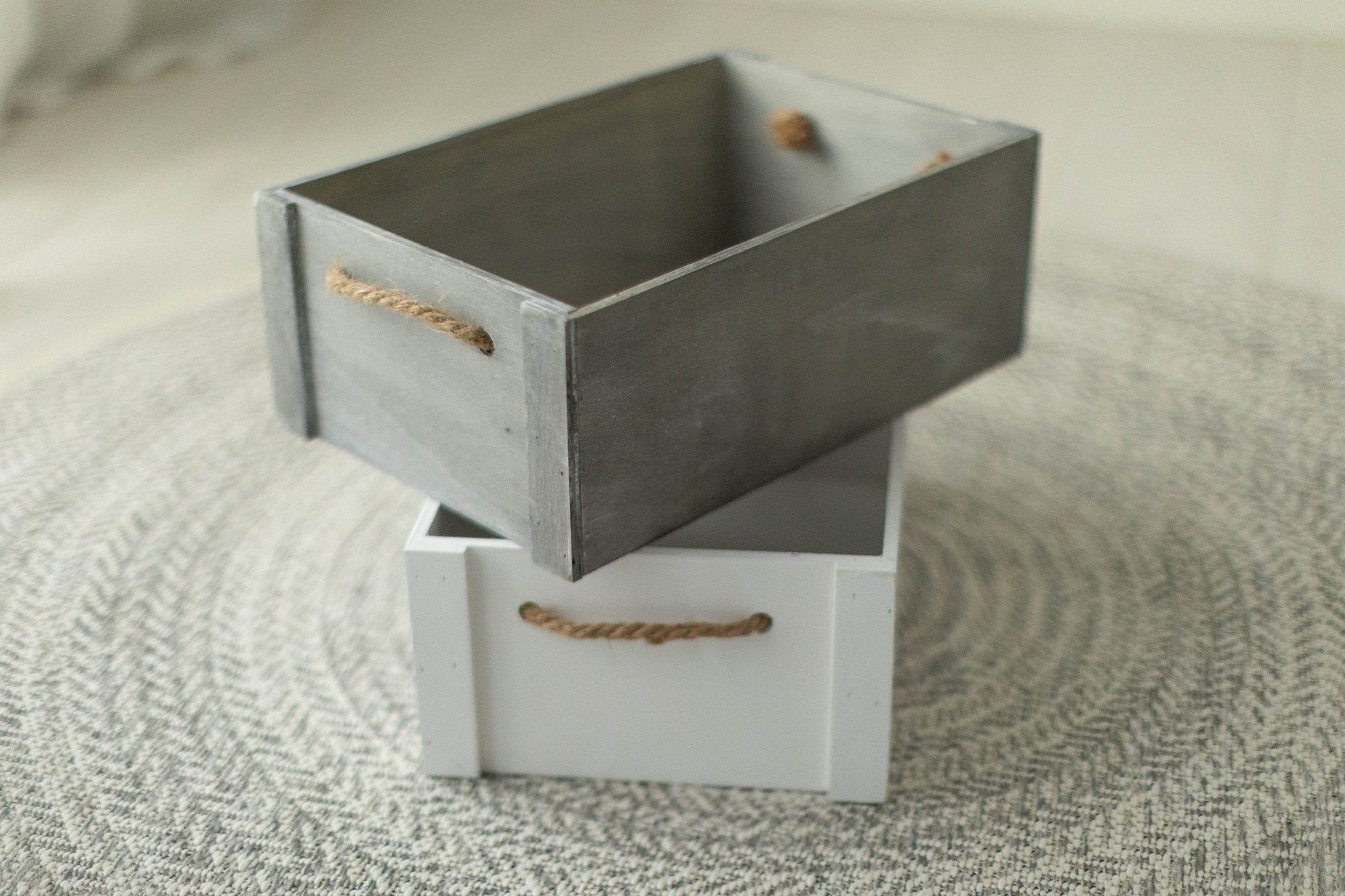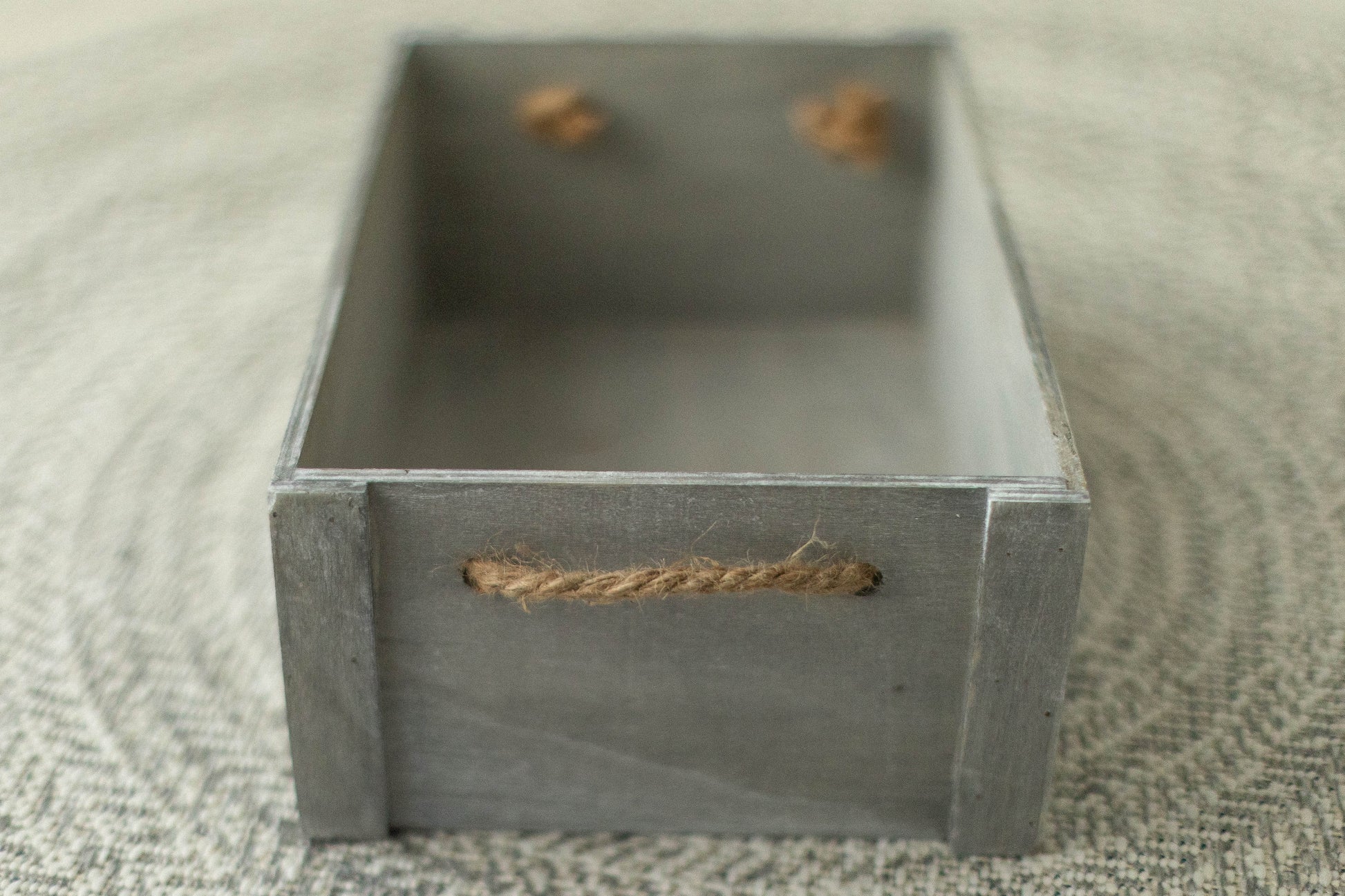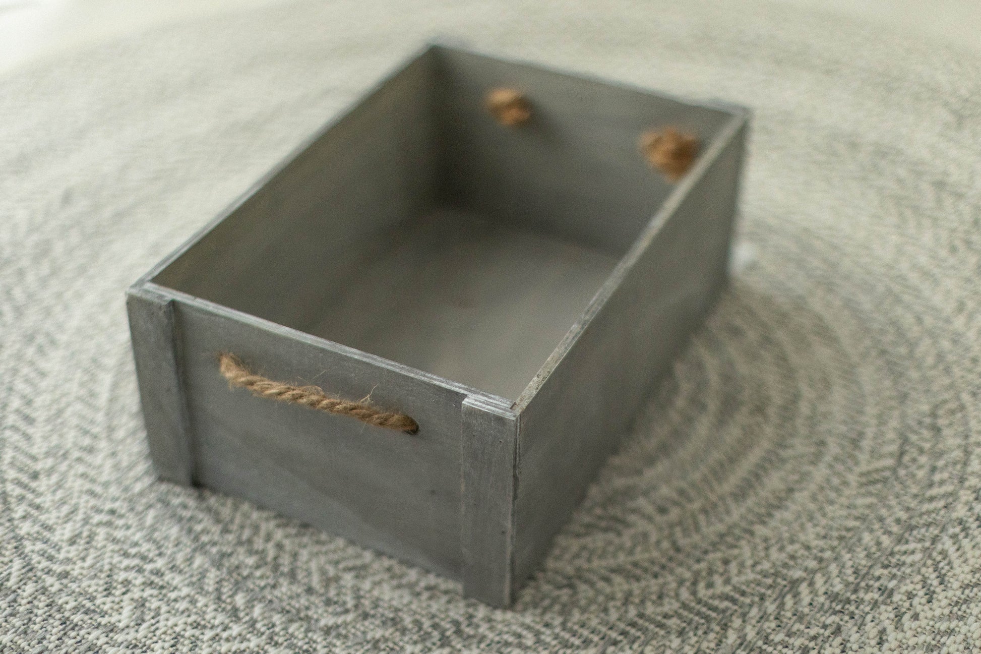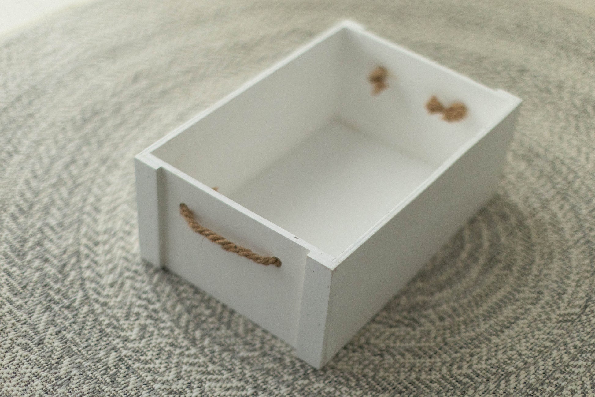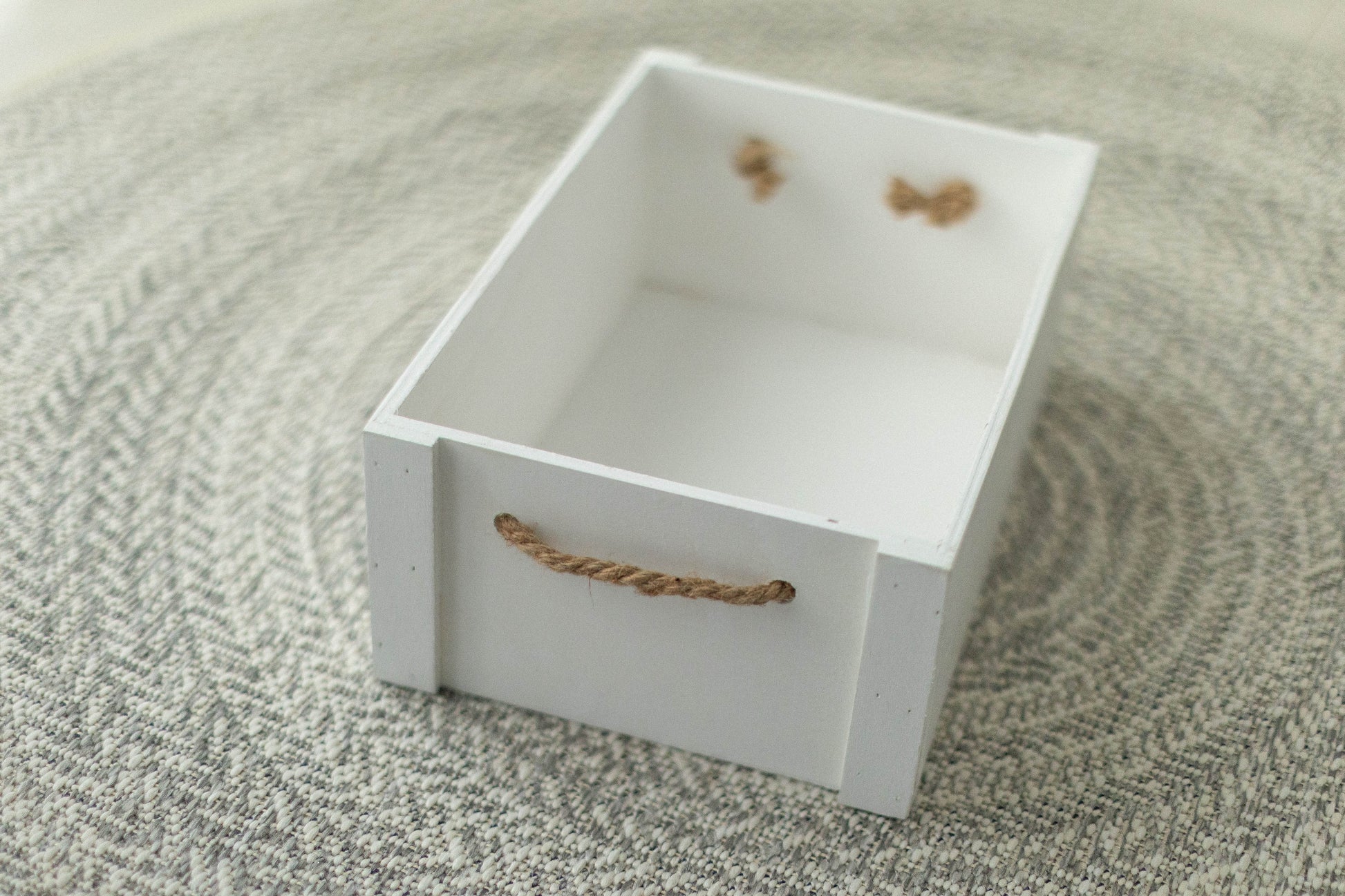 Props per posing neonato - cassetta in legno nel formato ideale a misura del neonato fasciato con maniglie in corda.